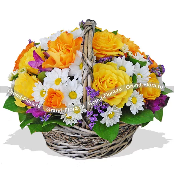 ДЕЛЮКС: роза желтая - 21 шт, хризантема кустовая ромашковая (белая) - 8 шт, альстромерия фиолетовая - 6 шт, статица - 6 шт, декоративная зелень, оазис, корзина.