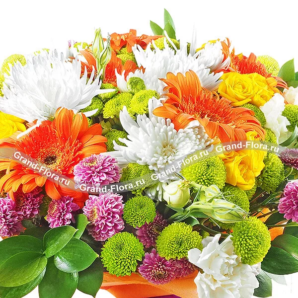 Сдержанный, но выразительный смешанный букет для вручения мужчине.Центр композиции составляют оранжевые герберы. Дополняют солнечные цветы несколько видов нежных хризантем, а также желтые элегантные кустовые розы. Белая эустома и рускус превосходно подчеркивают всю прелесть букета.