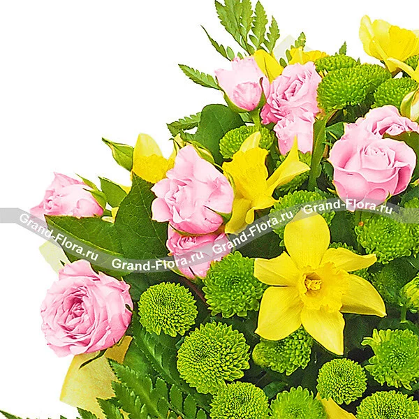 ЛЮКС: роза кустовая розовая - 4 шт, хризантема кустовая зеленая (сантини) - 3 шт, нарциссы - 5 шт, декоративная зелень, фетр желтый.