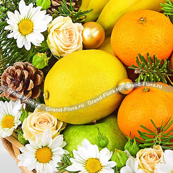 Уменьшенный: Бананы - 0,5 кг, мандарины - 0,5 кг, яблоки зеленые - 2 шт, яблоки красные - 1 шт, лимон - 1 шт, хризантема кустовая ромашковая - 1 шт, роза кустовая белая - 1 шт, шишки - 2 шт, хвоя, шары новогодние "золотые" небольшие - 3 шт, оазис, корзина средняя.