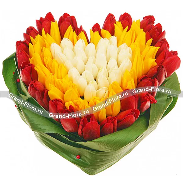 Стандартный: тюльпаны белые - 32шт., тюльпаны желтые - 41шт., тюльпаны красные - 28шт., оазис, декоративная зелень.