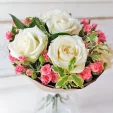Уменьшенный: роза белая - 3 шт., роза кустовая розово-белая (возможна замена на розовую/малиновую) - 2 шт., декоративная зелень, упаковка крафт, лента кремовая. Примерный размер: 20Х20 см.