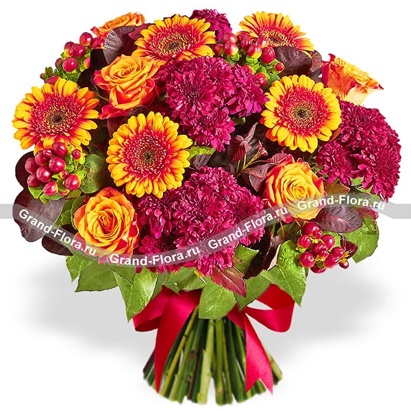 Стандартный: гербера оранжевая - 3 шт., роза оранжевая - 5 шт., хризантема фиолетовая кустовая - 3 шт., гиперикум - 2 шт., декоративная зелень, упаковка, лента.