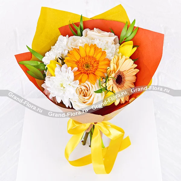 Стандартный: роза белая - 4 шт., гербера оранжевая - 1 шт., гербера желтая - 2 шт., тюльпан желтый - 5 шт., хризантема кустовая белая - 3 шт., декоративная зелень, упаковка, лента. Примерный размер: 30Х30 см.